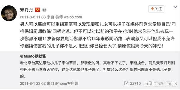 宋丹丹发微博说:“男人可以离婚可以重组家庭可以爱现妻和儿女可以携子在媒体前秀父爱称自己‘司机保姆厨师教练’四栖老爸...但不可以对以前的孩子在7岁时他求你带他出去玩一次你都不理,11岁管你要电话你都不给,14年来形同陌路...表演慈父可以,但我不允许你继续伤害我的儿子你不是人!!巴图:你已经长大了,请原谅妈妈今天的冲动!”