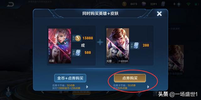 5、如果还没有元歌这个英雄的话就需要先购买英雄,点击左边下方的金币+购买按键;如果是已经有英雄的话,选择右边下方的点券购买按键