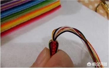 编的差不多能做扣眼的时候对折,取其中的一根线绕住打个单扣,此时每种颜色的线就是2根了。